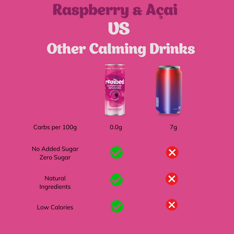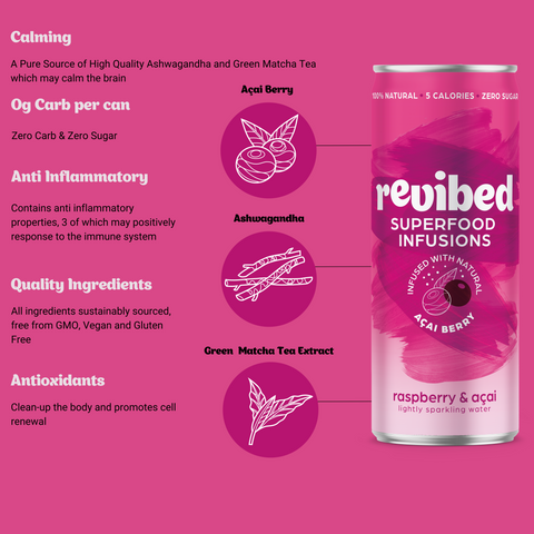 Calm your day with Revibed Superfood infused Raspberry & Açaí . Contains Açaí Extract, Ashwagandha Extract and Green Tea Extract. 100% natural, zero sugar, No artificial sweeteners and only 5 calories per serving.